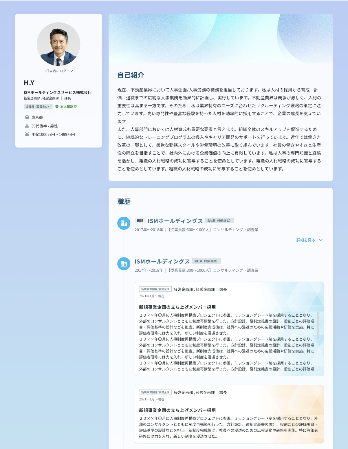 刷新されたプロフィールを知り合いにシェアしませんか? 2025年02月14日 09:50 更新 HiPro Directでは、プロフィールのデザインを今回大幅に刷新しました。 美しく見やすいデザインに刷新されましたので、ぜひこの機会にプロフィールを知り合いにシェアしませんか? プロフィールの外部公開は、プロフィールページ上部の公開設定から行うことができます。 ※公開URLを知っている人のみ、アクセスが可能になります。 プロフィールデザインの刷新背景 HiPro Directの過去のプロフィール画面には以下の課題点がありました。 ・プロフィールの編集画面と、実際に他人が閲覧する画面でデザインが異なる ・プロフィールの情報が地続きになっており、どこにどんな情報があるかわかりづらい ・プロフィールのデザインが地味なので、他人にシェアをしようと思えない これらの課題を以下のように刷新することで解決しました。 ・項目をカードごとに分類し、より見やすいデザインに ・角丸や透過、グラデーションなどを駆使して美しく洗練され、シェアしたくなるデザインに 詳細・不明点はお問い合わせフォームよりお問い合わせください。 関連記事 【2/19開催】富山副業マッチング交流会~地域での副業に挑戦したいあなたに。~ 面談ガイド(個人会員) forLocal案件とは 条件合意の仕方(個人会員) 2025年6月6日 メンテナンスのお知らせ