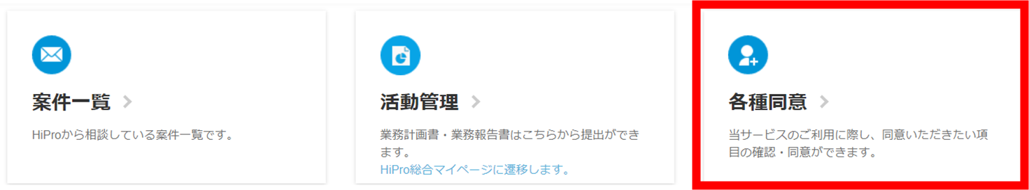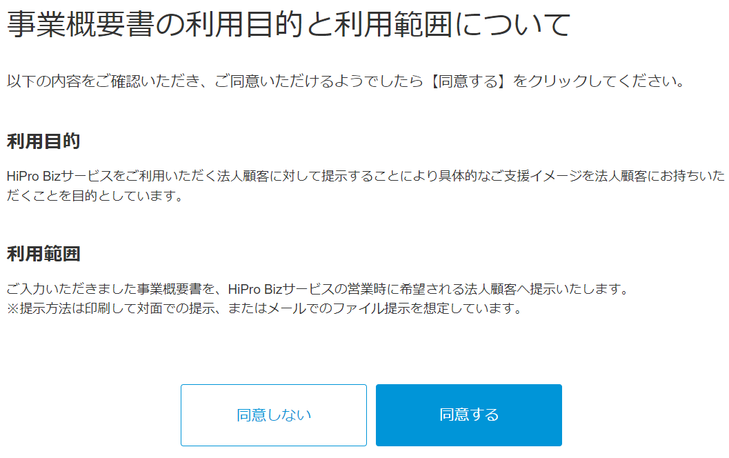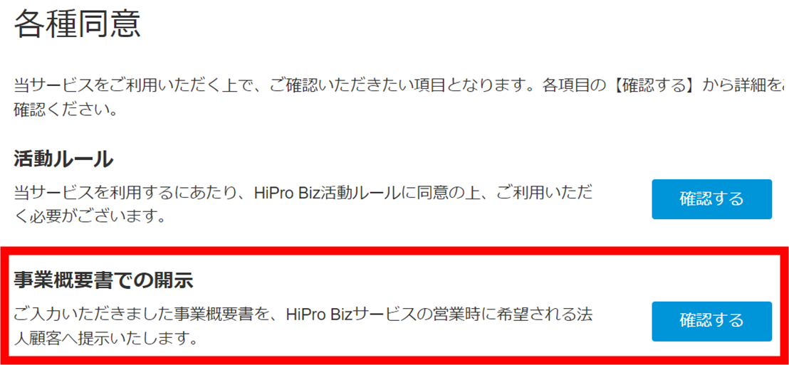 事業概要書の企業への開示に関して 2025年03月03日 04:27 更新 HiPro Bizはサービスの特性上、企業が直接プロ人材の皆さまのご登録情報を閲覧することはございません。必ずHiProの案件担当者を介して情報が開示されます。 企業に対して案件を開示するのは、HiProの案件担当が事業概要書の開示可否の確認をし、開示許諾をいただいた後に開示となります。 ただし、マイページ上で、【事業概要書での開示】に同意いただいていた場合、事前の確認をせずに企業へ開示する場合がございます。 ※"同意しない"を選択いただいた場合は、案件ごとにHiProの案件担当が開示可否の確認を行います。 ▼【事業概要書開示許諾】確認方法 HiPro Bizマイページ > 各種同意 > 事業概要書での開示 "確認する" を押下 関連記事 プロフィールの公開設定について(個人会員) マイページの画面が上手く表示されない 登録しているメールアドレスを変更したい 基本情報のHiProサービス間(Biz / Tech /Direct)での共有について 支援が開始するまでの流れについて知りたい