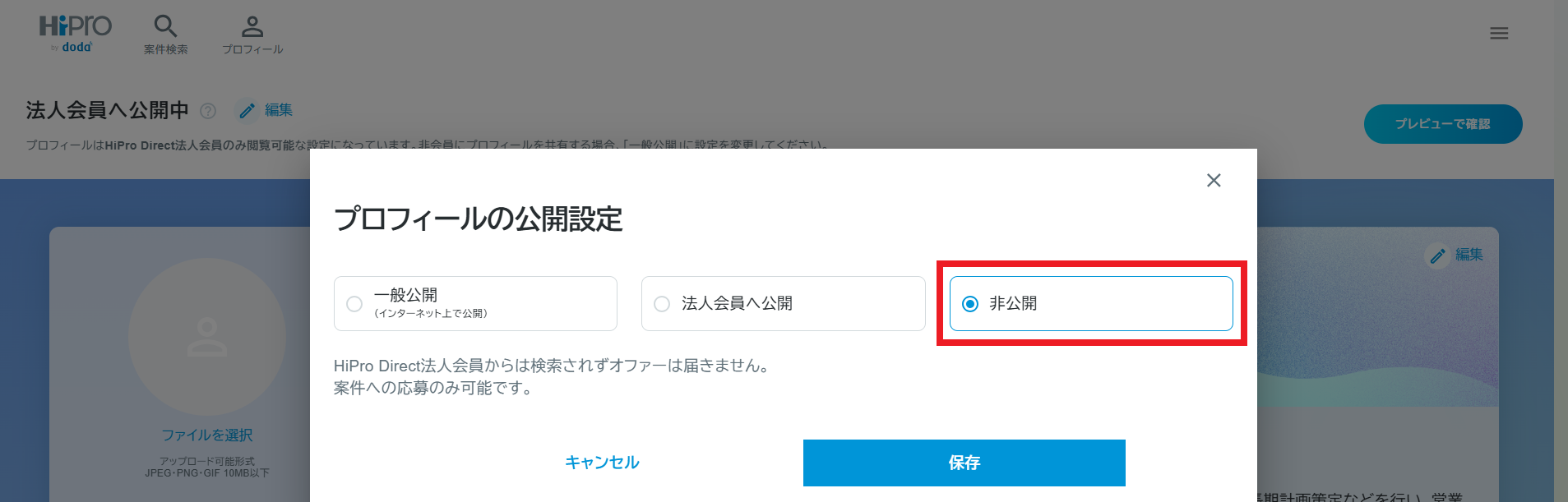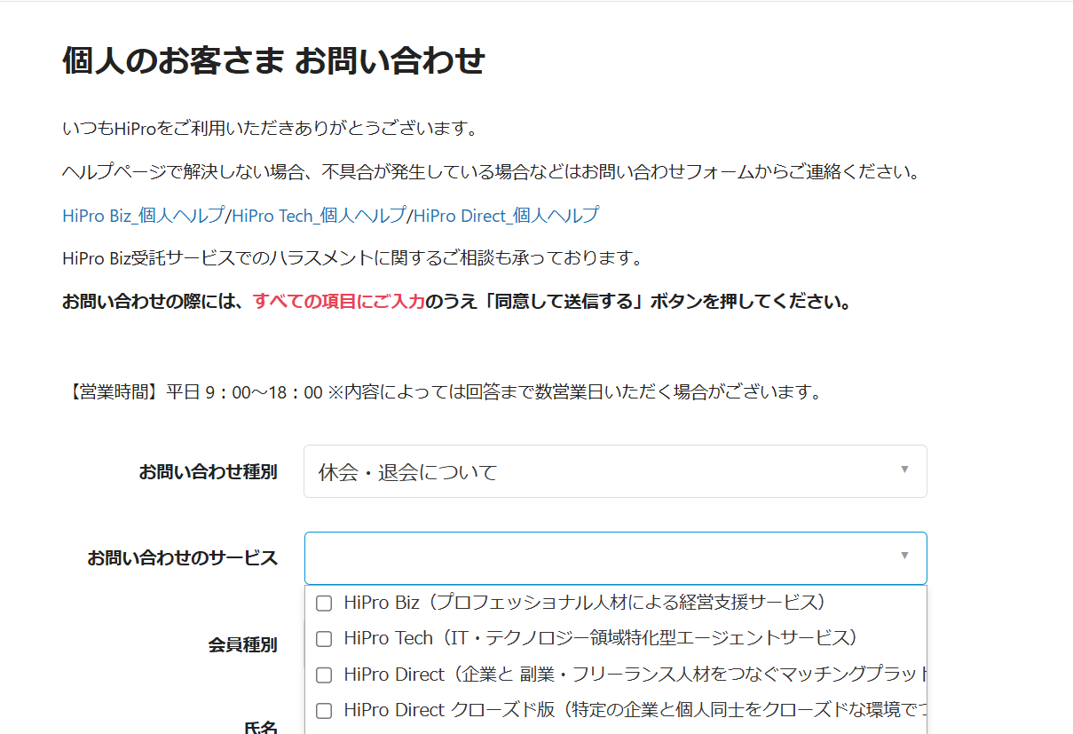 退会したい場合はどのようにすればいいですか? 2025年09月15日 09:55 更新 HiPro Directをご利用の場合、プロフィールを非公開設定にすることで、法人から検索されずオファーもこなくなります。しばらく副業を探す活動を休止したい場合には、非公開設定をお薦めします。 HiPro BizまたはHiPro Techをご利用の場合、担当営業にしばらく活動休止されたい旨をご相談ください。 HiProを完全に退会したい場合、共通プロフィール最下部の「退会」を押下いただき、お問い合わせフォームよりご連絡をお願いいたします。お問い合わせ種別で「休会・退会について」を選択>お問い合わせサービス欄で退会したいサービスを選択(複数選択可) なお、複数のHiProサービスをご利用中で、特定のサービスのみ退会する場合(HiPro Biz / HiPro Tech / HiPro Direct / HiPro Directクローズド版いずれかのご利用は継続する場合)、氏名やメールアドレスなどの基本情報、および、スキル・経歴などのプロフィール情報はHiPro共通の登録情報となっているため、退会したサービス側からは退会した個人会員様の情報は閲覧・利用不可となりますが、システム上には残ることとなります。ご登録情報の完全削除をご希望の場合、全てのHiProサービスから退会いただくと、基本情報およびプロフィール情報はシステム上からも削除されます。※HiProにご登録中にプロ人材として活動実績があり、お支払い履歴がある個人会員様の場合、電子帳簿保存法など法令の定めに基づいて必要な情報は別途保存いたしますので、ご承知おきください。 関連記事 【重要】新プロフィール機能のリリースに関するお知らせ(HiPro) 退会したい場合はどうしたらよいですか? プロフィールの公開設定について(個人会員) 退会したい場合はどのようにすればいいですか? 【2025/12/23(火)ランチタイム開催】ミドルシニアが副業を勝ち取る方法を学びませんか?ウェビナーのご案内