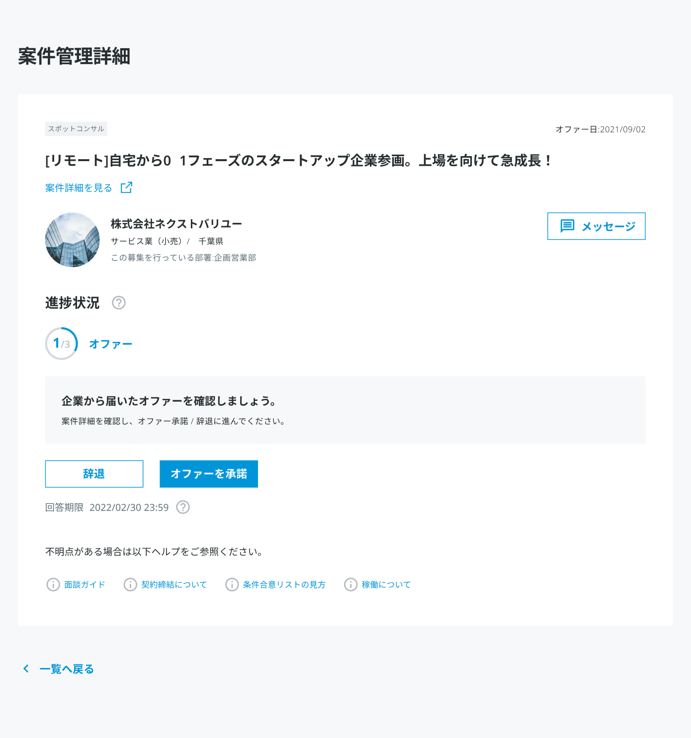 スポットコンサルの応募・オファーから稼働完了までの流れ(個人会員) 2024年11月27日 05:55 更新 1.案件に応募する、またはオファーを待ちます。 案件はヘッダーの新着案件から見ることができます。 オファーは案件管理から見ることができます。 オファーについては、こちらの記事をご参照ください。 2.(オファーの場合)オファーの承諾を判断します。 (応募の場合)企業からの応募の承認を待ちます。 案件管理でオファー・応募のステータスを見ることができます。 メッセージでやり取りして面談日程などを決めましょう。 メッセージでのやり取りについてはこちらの記事もご参照ください。 オファーが来たものは、案件をクリックして案件管理詳細に進み、オファーを承諾する場合は「オファーを承諾」をクリックしましょう。オファーの回答期限はオファーを受けた翌日から起算して8日目の7:59です。 【不成立となる条件】 以下のようなときに不成立となります。 法人会員が応募を不成立にしたとき 法人会員が退会したとき 3.成立した場合、スポットコンサルの日程調整をします。 成立すると、案件管理詳細のステータスが「条件合意」に変わります。 法人会員とスポットコンサルの日程調整を行いましょう。 4.合意が取れた場合、電子契約の事前同意を行い、条件合意に進みます。 法人会員が、「条件合意に進む」を選択すると、条件合意に進みます。 電子契約の事前同意と条件合意については、以下の記事をご参照ください。 条件合意の仕方(個人会員) 条件合意とはなんですか 5.スポットコンサルを実施します。 契約内容に基づき、法人会員と1時間程度の面談をします。法人会員の課題を解決しましょう。 6.稼働報告 7.支払い スポットコンサルの場合は、パーソルキャリア株式会社が法人会員から報酬を預かり、個人会員へお支払いします。支払期日が休日の場合、前営業日の振り込みとなります。 関連記事 プロジェクトの応募・オファーから稼働完了までの流れ(個人会員) 条件合意の仕方(個人会員) 面談ガイド(個人会員) 稼働報告/稼働開始報告機能の使い方(個人会員) 法人名義や屋号での登録はできますか?