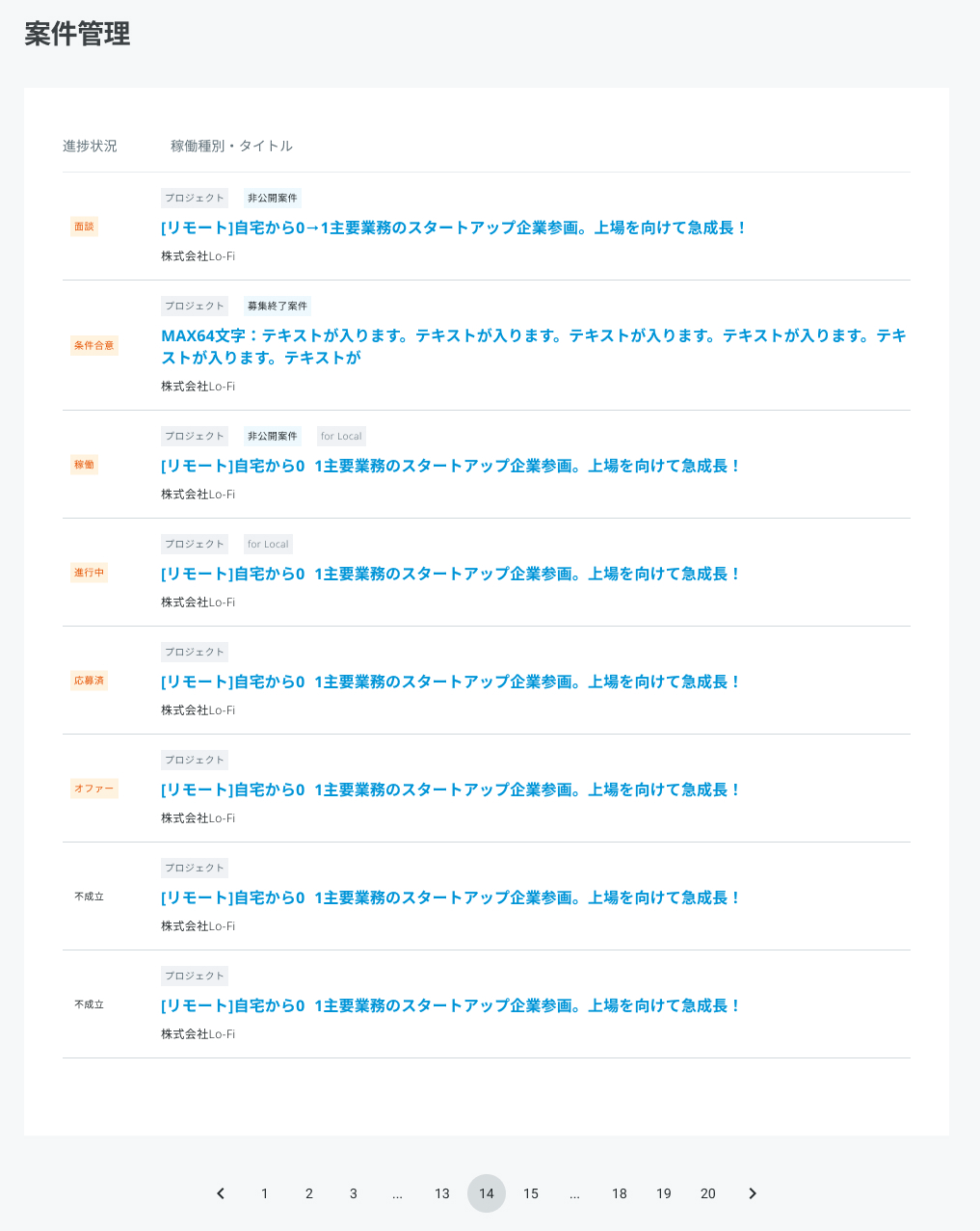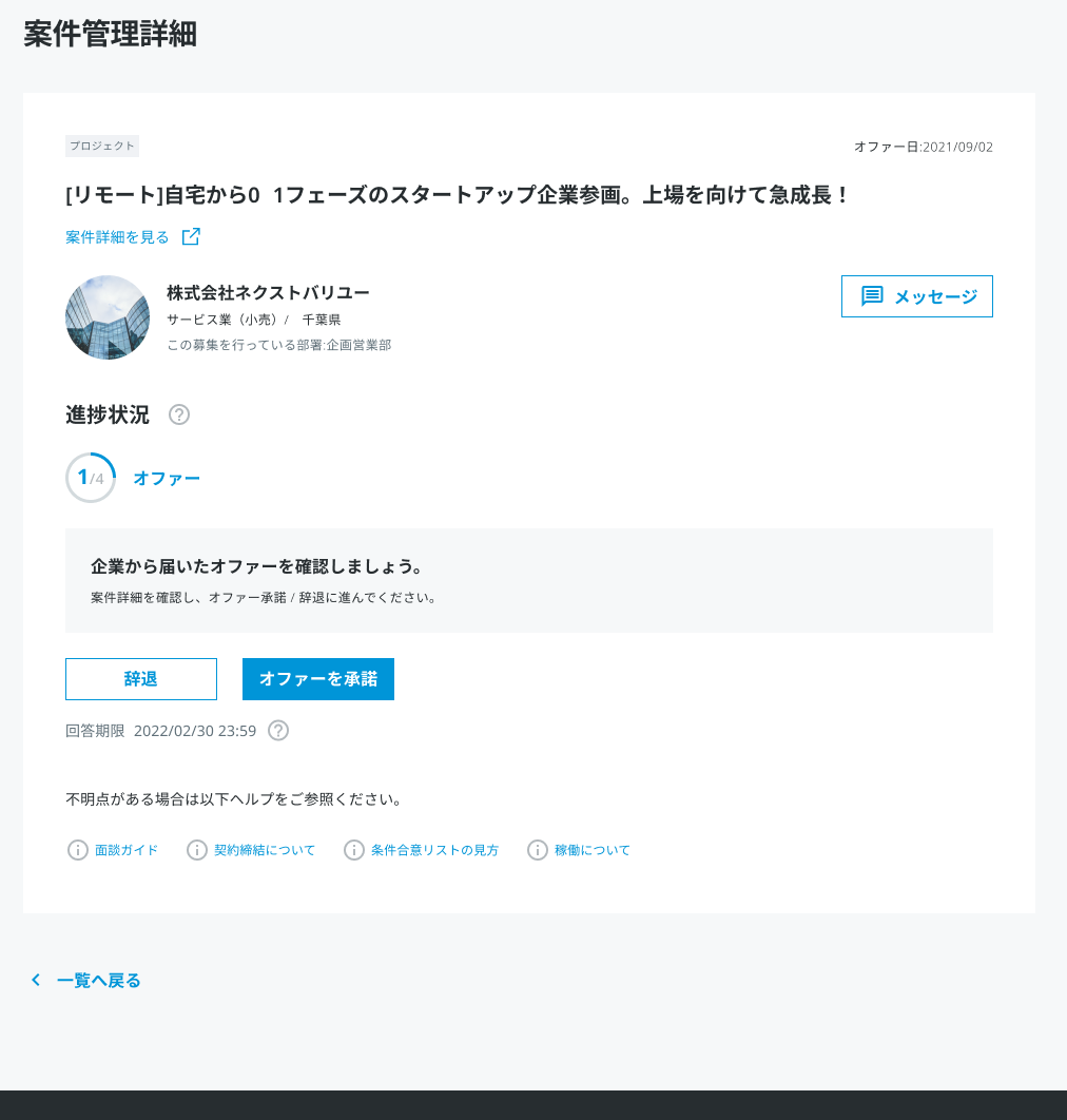プロジェクトの応募・オファーから稼働完了までの流れ(個人会員) 2024年11月13日 08:42 更新 1.案件に応募する、またはオファーを待ちます。 案件はヘッダーの新着案件から見ることができます。 オファーは案件管理から見ることができます。 オファーについては、こちらの記事をご参照ください。 2.(オファーの場合)オファーの承諾を判断します。 (応募の場合)企業からの応募の承認を待ちます。 案件管理でオファー・応募のステータスを見ることができます。 オファーが来たものは、案件をクリックして案件管理詳細に進み、オファーを承諾する場合は「オファーを承諾」をクリックしましょう。 【不成立となる条件】 以下のようなときに不成立となります。 法人会員が応募を不成立にしたとき 法人会員が退会したとき 3.オファー・応募成立した場合、面談の日程調整をします。 成立すると、案件管理詳細のステータスが「面談」に変わります。 メッセージでやり取りして日程などを決めましょう。 メッセージでのやり取りについてはこちらの記事もご参照ください。 4.面談をします。プロジェクトの内容や条件をすり合わせます。 1時間程度の面談をします。案件詳細での不明点や、具体的な案件内容、合意条件 などを話し合いましょう。 5.合意が取れた場合、電子契約の事前同意を行い、条件合意に進みます。 法人会員が、「条件合意に進む」を選択すると、条件合意に進みます。 電子契約の事前同意と条件合意については、以下の記事をご参照ください。 条件合意の仕方(個人会員) 条件合意とはなんですか 6.契約内容に基づき、稼働を開始します。 契約期間中は進捗や成果物についてなど、法人会員と適切なコミュニケーションをとりながら進めていきましょう。 7.稼働が終了します。稼働報告をします。 8.支払い プロジェクトの場合は、法人会員から個人会員に直接支払いが行われます。 請求書の発行などは、個人会員より必要に応じて行なってください。 関連記事 スポットコンサルの応募・オファーから稼働完了までの流れ(個人会員) 面談ガイド(個人会員) マッチングから面談までのやりとり(個人会員) 本人確認書類を何度かアップロードしているが「非承認」のまま変わらない場合はどうしたらいいですか? 【重要】HiPro 個人会員利用規約改定のお知らせ(2024年2月6日改定予定)
