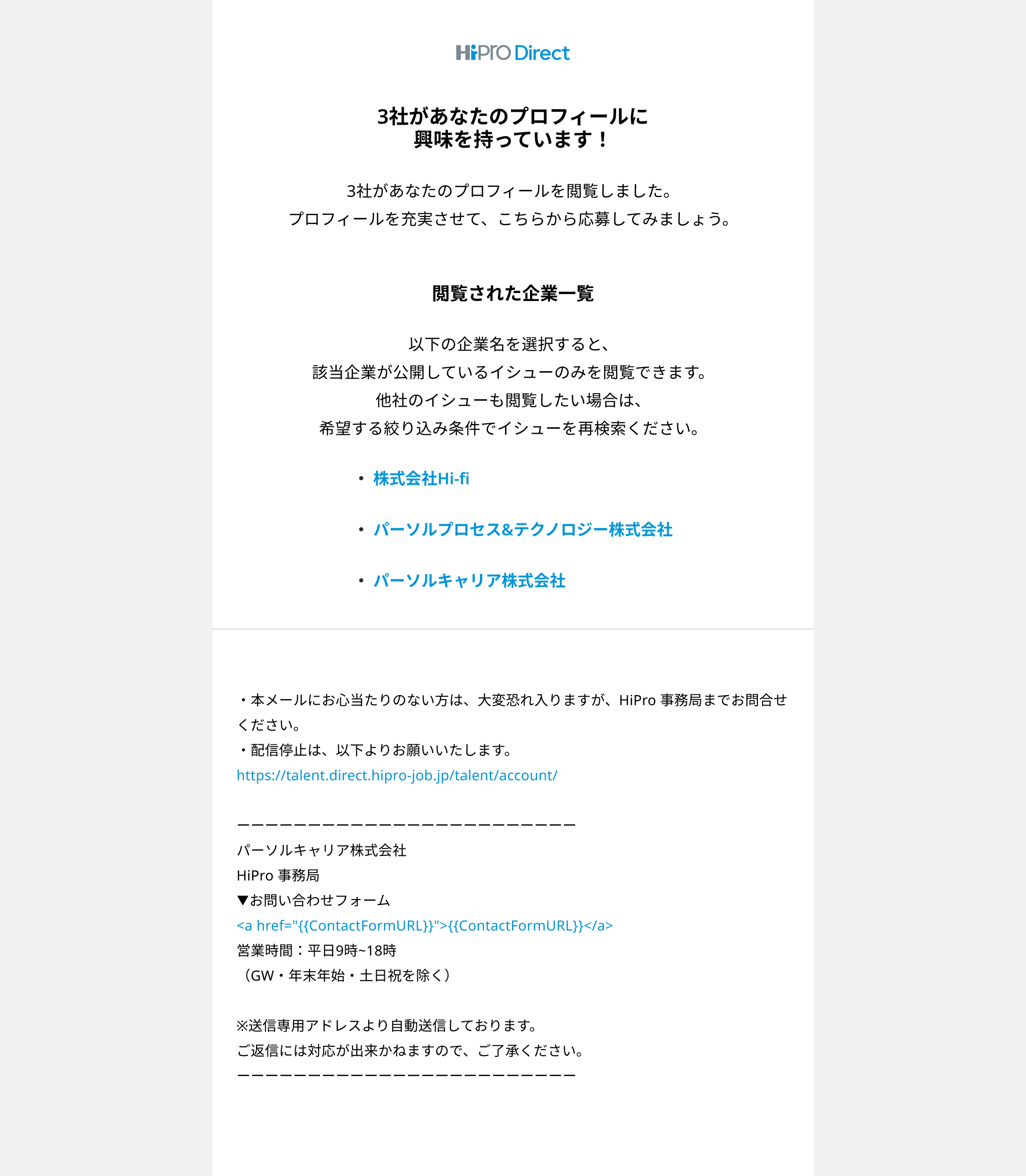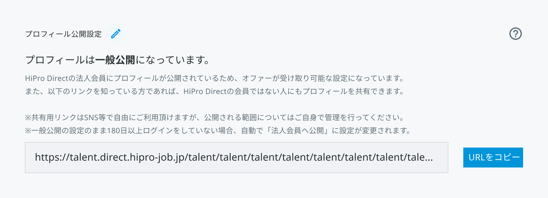 2023/10/17 機能リリース(個人)【プロフィールの一般公開・足跡通知】 2024年09月05日 03:29 更新 2023/10/17の個人会員向け機能アップデート内容です。ぜひご覧ください。 まとめ プロフィールを一般公開することができる 自分のプロフィールがプロ検索で閲覧されたことを足跡通知としてメールで受け取り、通知元企業の案件を閲覧できる プロフィールの一般公開について プロフィール画面の公開設定から「一般公開」を選ぶことができるようになりました。 「一般公開」にすると、個人ごとに発行されたURLをSNS等で共有することで、HiPro Directで作成したプロフィールを他の人にシェアすることができます。 プロフィールの足跡通知について プロ検索画面から自分のプロフィール詳細画面を閲覧した法人会員が誰か、「足跡通知」としてメールで受け取れるようになりました。足跡通知の受信設定はアクティビティ通知と連動しています。 届いた通知メール本文に記載の企業名には、閲覧企業のURLが埋め込まれており、選択いただくとその企業が公開している案件のみを表示する一覧ページが閲覧できます。興味を持ってくれた企業とその公開案件から、応募先探しにご活用ください。 機能の詳細な使い方はこちら 詳細・不明点は担当までお問い合わせください。 次のアップデートは【10/31(火)】の予定です!ご期待ください。 関連記事 プロフィールの公開設定について(個人会員) プロフィール情報の公開範囲について知りたい 2023/12/21 機能リリース(個人)【トピックの相談ルーム】 条件合意の仕方(個人会員) 【イベント案内】【関西エリアの方必見!】大阪から世界へ~未来を創造する共創拠点「FUTRWORKS」で成長スタートアップ×副業MeetUpを開催!