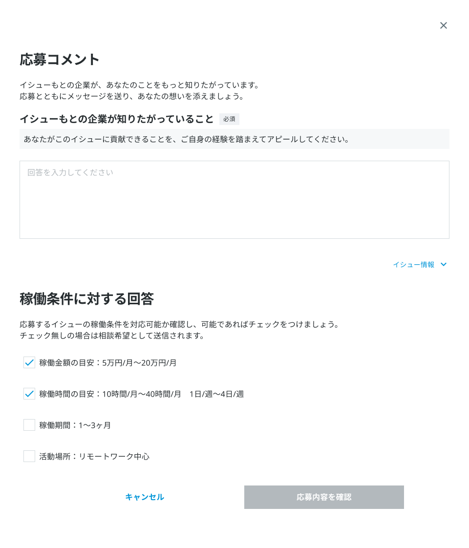 2024/2/13 機能リリース(個人)【稼働条件への対応可否の回答】 2024年09月04日 08:11 更新 2024/2/13の個人会員向け機能アップデート内容です。ぜひご覧ください。 まとめ 案件への応募時に稼働条件への対応可否が回答可能になりました 稼働条件への対応可否の回答 案件に応募する際に、応募コメントに加えて、案件に設定された稼働条件への対応可否を回答できる機能が追加されました。 例としてプロフィールに希望とする報酬金額を「時給1万円以上」で設定していた場合に、案件の報酬金額の目安が「時給5000円」だった場合、今までであれば初見でミスマッチと判断されてしまうことがあり得ましたが、この機能により上記のような機会損失が解消される可能性が高まります。 稼働条件への対応可否を回答するチェックボックスは、案件に設定された稼働条件が「応相談」以外の場合に表示されます。 ・チェックボックスにチェックを行うと、「対応可能」として回答されます。 ・チェックボックスにチェックをつけない場合、「相談希望」として回答されます。 ※サンプル画像 詳細・不明点は担当までお問い合わせください。 次のアップデートは【3/12(火)】の予定です!ご期待ください。 関連記事 2024/3/14 機能リリース(個人)【応募後の法人側の回答期限機能】 2024/5/9 機能リリース(個人)【ご利用ガイド】 プロフィールの上手な書き方 2025年6月6日 メンテナンスのお知らせ forLocal案件とは